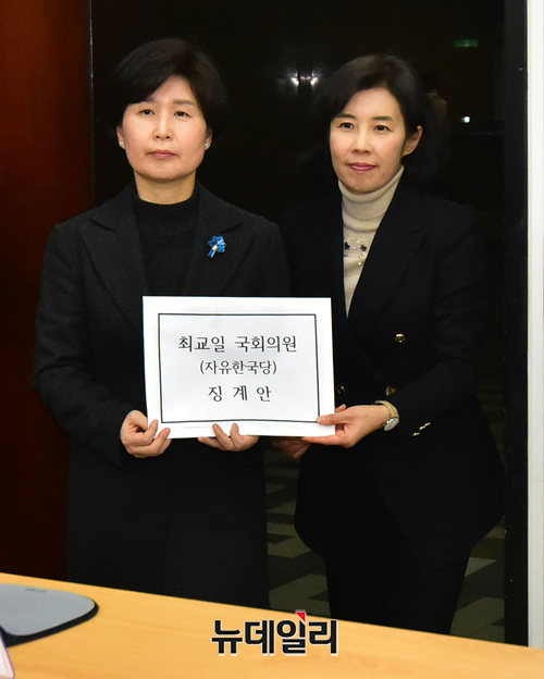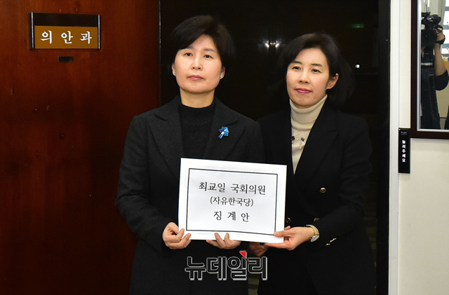더불민주당 전국여성위원장인 백혜련 의원과 박경미 의원이 7일 오후 국회 의안과에 최교일 자유한국당 의원 징계안을 제출하고 있다. 최 의원은 미국 출장 당시 스트립바 방문 의혹을 받고 있다.