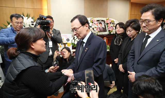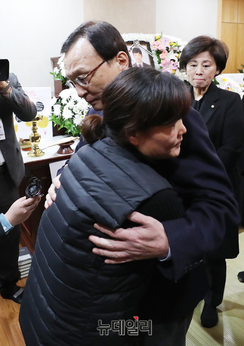 이해찬 더불어민주당 대표가 7일 오후 서울 종로구 서울대학교병원 장례식장에 마련된 태안 화력발전소 피해자 고 김용균 씨의 빈소를 찾아 조문을 마치고, 고 김용균씨 어머니를 위로하고 있다.