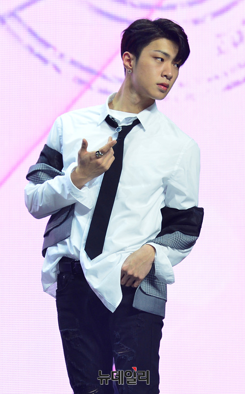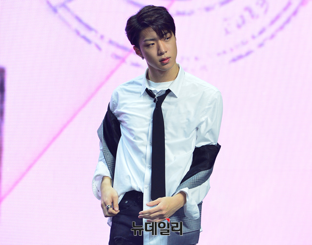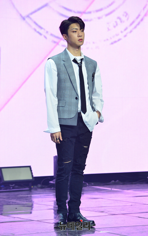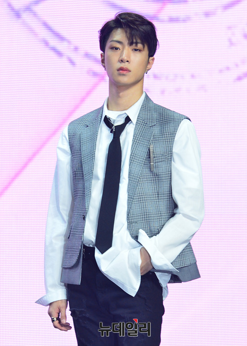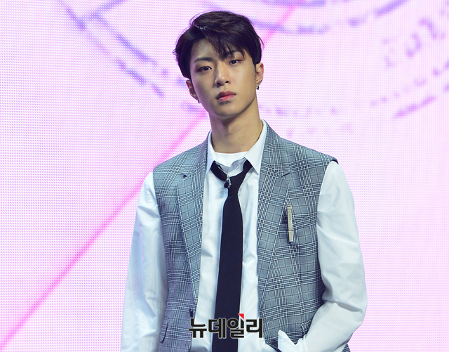 아이돌그룹 온앤오프(ONF) 와이엇이 7일 오후 서울 송파구 올림픽공원 K-아트홀에서 열린 3집 미니앨범 발매기념 쇼케이스에서 포토타임을 갖고 있다.