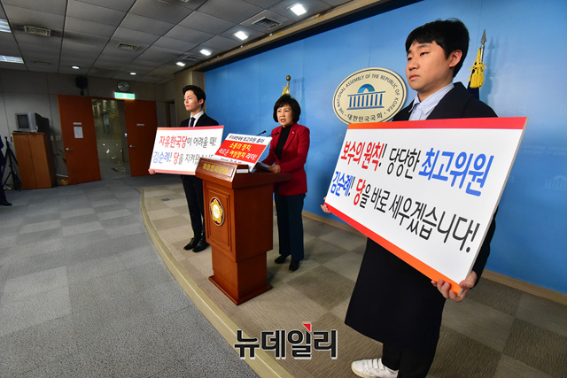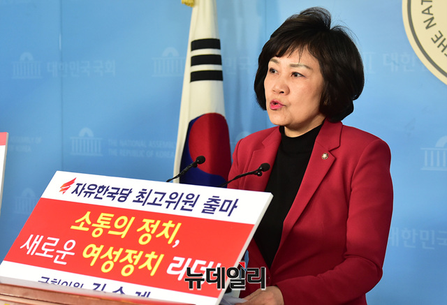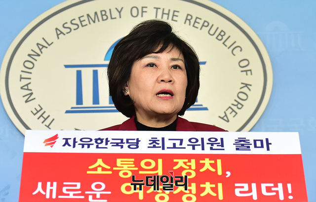 김순례 자유한국당 의원이 8일 오전 국회 정론관에서 2.27 전당대회 최고위원 출마선언을 하고 있다.