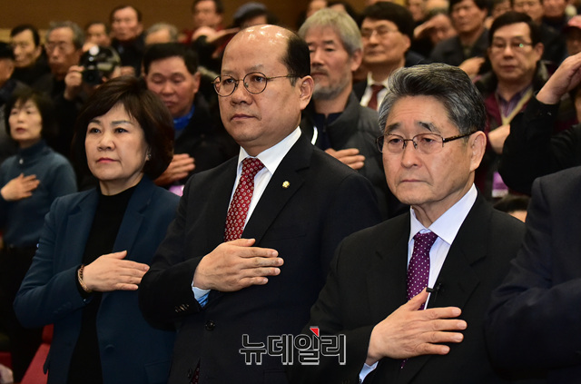 지만원 씨와 이종명, 김순례 자유한국당 의원 등이 8일 오후 국회 의원회관에서 자유한국당 김진태·이종명 의원 주최로 열린 5.18 진상규명 대국민공청회에서 국민의례를 하고 있다.
