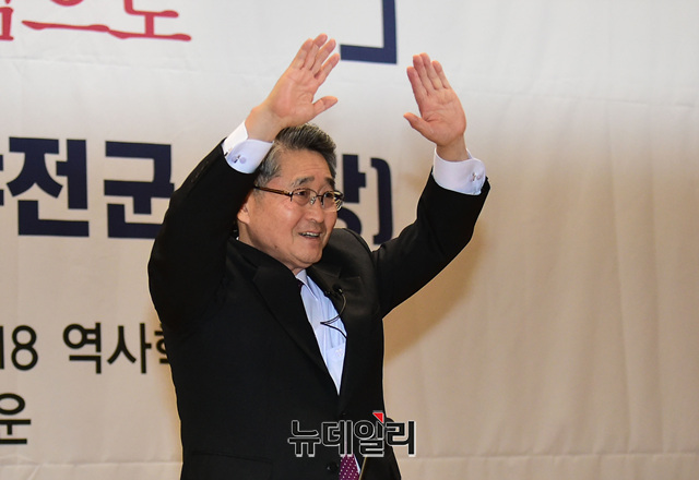 지만원 씨가 8일 오후 국회 의원회관에서 자유한국당 김진태·이종명 의원 주최로 열린 5.18 진상규명 대국민공청회에 발표자로 참석해 지지자들에게 손을 들어 인사하고 있다.