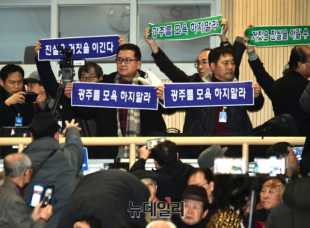5.18 진상규명 대국민공청회가 8일 오후 국회 의원회관에서 자유한국당 김진태·이종명 의원 주최로 열린 가운데 공청회를 반대하는 시민들이 '광주를 모욕하지 말라' 등의 반대문구가 적힌 손피켓을 들고 항의하고 있다.