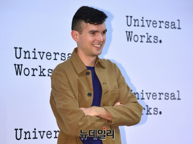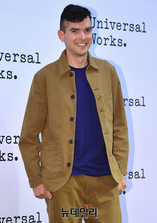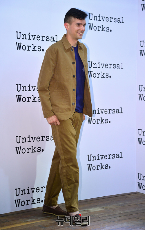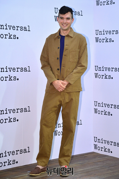 제임스 후퍼가 8일 오후 서울 강남구 NH 인터내셔널 쇼룸에서 열린 맨즈웨어 브랜드 '유니버셜 웍스(Universal Works)' 국내 런칭 기념행사에서 포토타임을 갖고 있다.