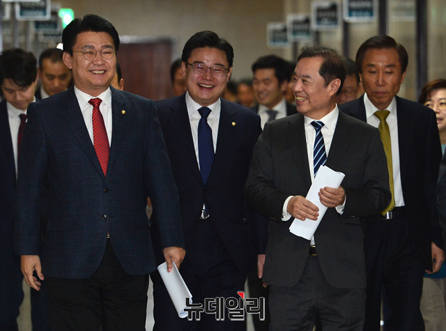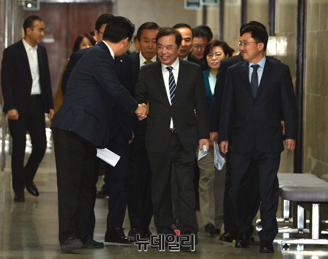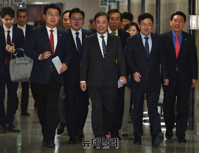 김병준 자유한국당 비상대책위원장과 정용기 정책위의장이 11일 오전 국회에서 열린 비상대책위원회에 입장하고 있다.