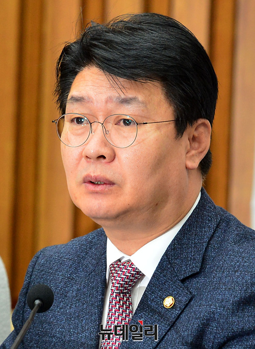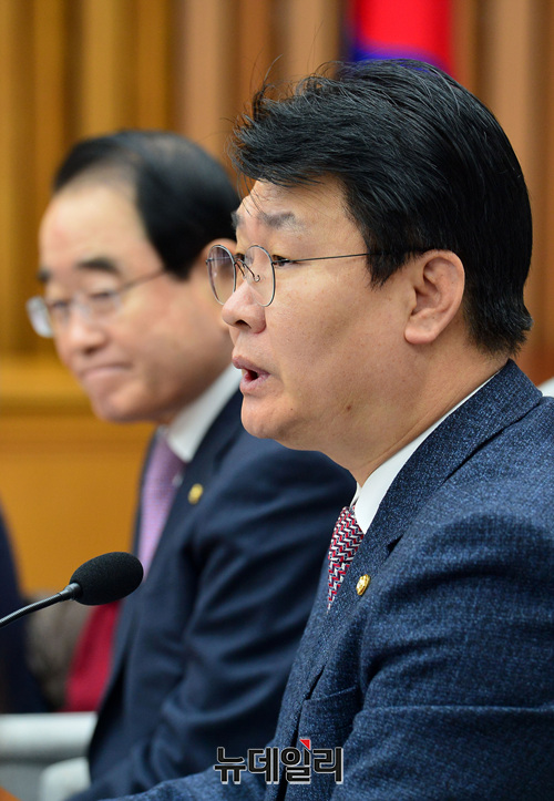 정용기 자유한국당 정책위의장이 12일 오전 국회에서 열린 원내대책회의에서 모두발언을 하고 있다.