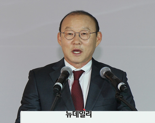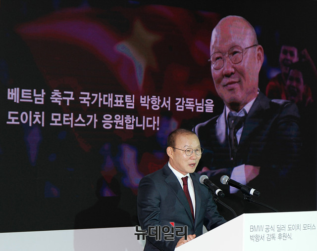 박항서 베트남 축구 국가대표 감독이 12일 오전 서울 성동구 도이치모터스 성수통합센터에서 열린 '박항서 감독 후원식'에 참석해 인사말을 하고 있다.