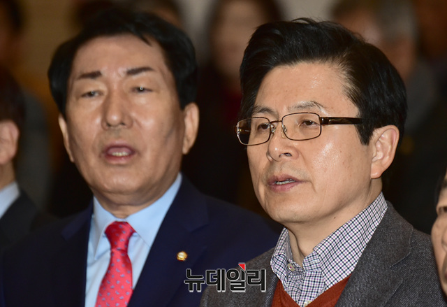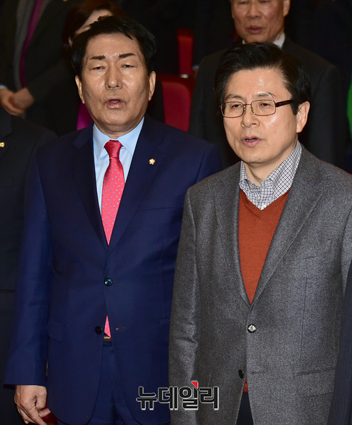 2.27 자유한국당 전당대회 당대표 출마 선언을 한 황교안 전 국무총리가 12일 오후 국회 의원회관에서 열린 안상수 의원의 '침몰하는 대한민국을 구하라' 출판기념회 참석해 안 의원과 국민의례를 하고 있다.