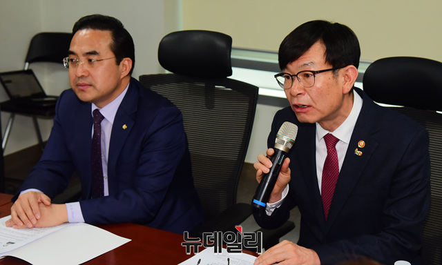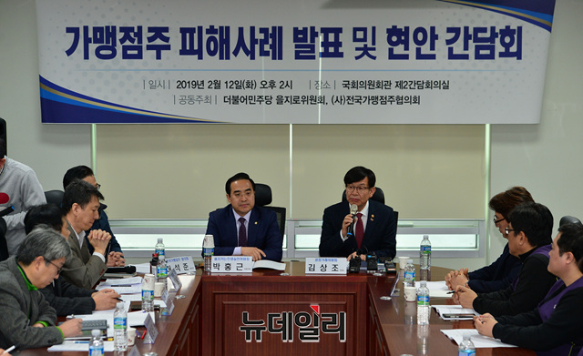 김상조 공정거래위원회 위원장이 12일 오후 국회 의원회관 제2간담회장에서 열린 '가맹점주 피해사례 발표 및 현안 간담회'에서 발언을 하고 있다.