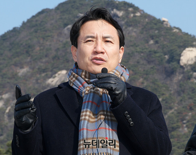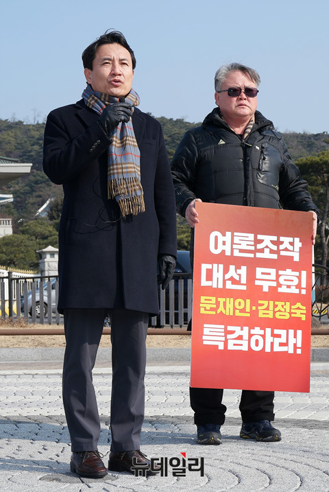 김진태 자유한국당 의원이 13일 오전 서울 종로구 청와대 분수대 앞에서 열린 기자회견에서 발언하고 있다. 김 의원은 기자회견이 직후 '여론조작 대선무효! 문재인·김정숙 특검하라!'고 적힌 손피켓을 들고 1인시위에 나섰다.
