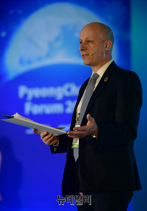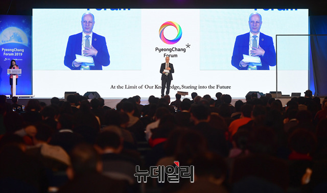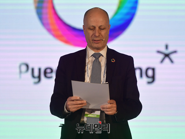 마허 나살(Maher NASSER) UN 해외공보국장이 13일 오후 강원 평창 알펜시아리조트 컨벤션센터에서 열린 '평창포럼 2019' 개막식에서 축사를 하고 있다.'평창포럼2019'는 '지식의 경계에서 바라본 지구 미래(At the Limit of Our Knowledge, Staring into the Future)‘를 주제로 지구와 인류의 공동번영을 목표로 모인 세계 각지의 전문가들과 정부, 강원도 관계자, UN관계자, NGO, 일반 참가자 등 1,000여명이 참여해 13일부터 15일까지 진행된다. (강원 평창=정상윤 기자)