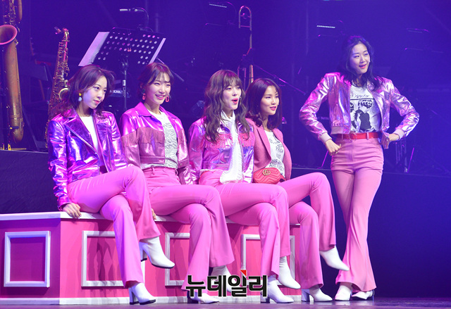 팝시컬 그룹 핑크레이디가 13일 오후 서울 광진구 예스24 라이브홀에서 열린 뮤지컬 '그리스' 제작발표회 및 쇼케이스에서 데뷔곡을 선보이고 있다.