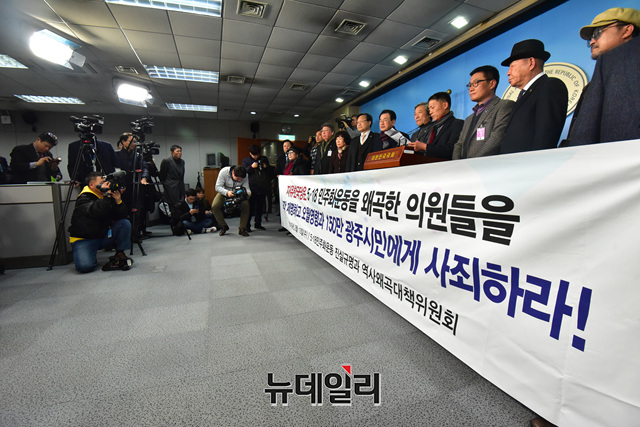 '5·18민주화운동 진실규명과 역사왜곡대책위원회' 회원들과 장병완 민주평화당 원내대표가 13일 오후 국회 정론관에서 기자회견을 갖고 자유한국당 김진태, 이종명, 김순례 의원의 제명과 사과를 요구하는 기자회견을 갖고 있다.