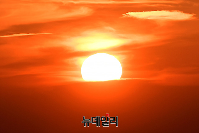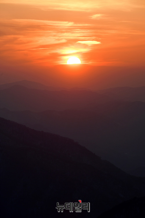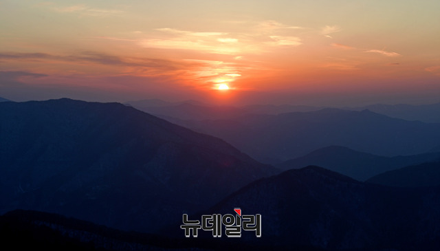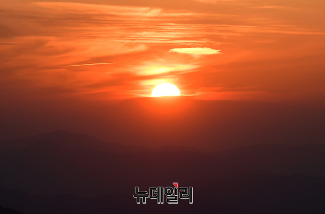 강원 평창군 대관령면 용산리에 위치한 발왕산에서 본 13일 일몰. 이날 일몰은 오후 6시 4분께 시작됐다. 발왕산은 해발고도 1,458m로 국내에서 12번째로 높은 산이다. (강원 평창=정상윤 기자)