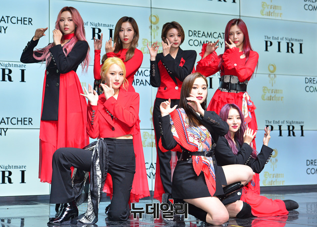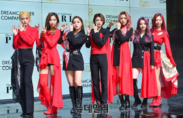 걸그룹 드림캐쳐가 13일 오후 서울 강남구 슈피겐홀에서 열린 네번째 미니앨범 'The End of Nightmare(디 엔드 오브 나이트메어)' 쇼케이스에서 포토타임을 갖고 있다.
