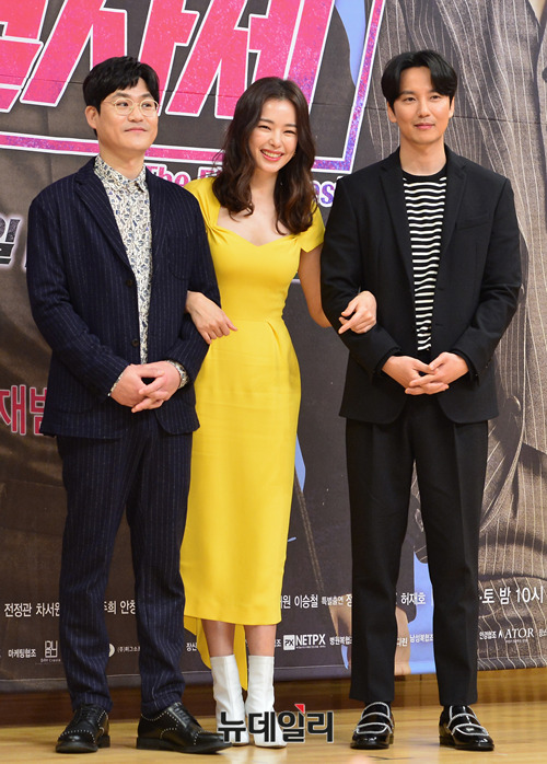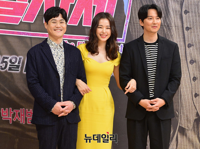 배우 김성균(왼쪽부터), 이하늬, 김남길이 15일 오후 서울 양천구 SBS 사옥에서 열린 금토드라마 열혈사제 제작발표회에서 포토타임을 갖고 있다.
