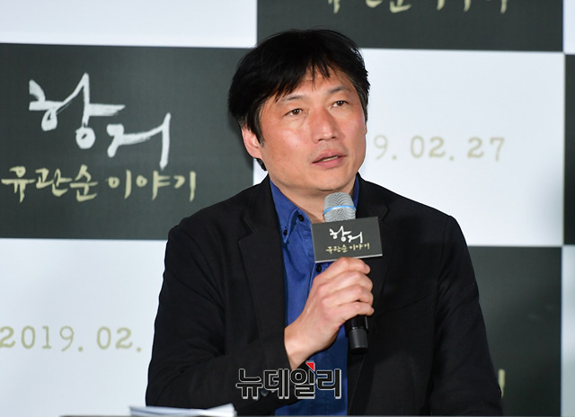 조민호 감독이 15일 오후 서울 광진구 롯데시네마 건대입구점에서 열린 영화 '항거(각본·감독 조민호)' 언론시사회에서 인사말을 하고 있다. 영화는 27일 개봉.