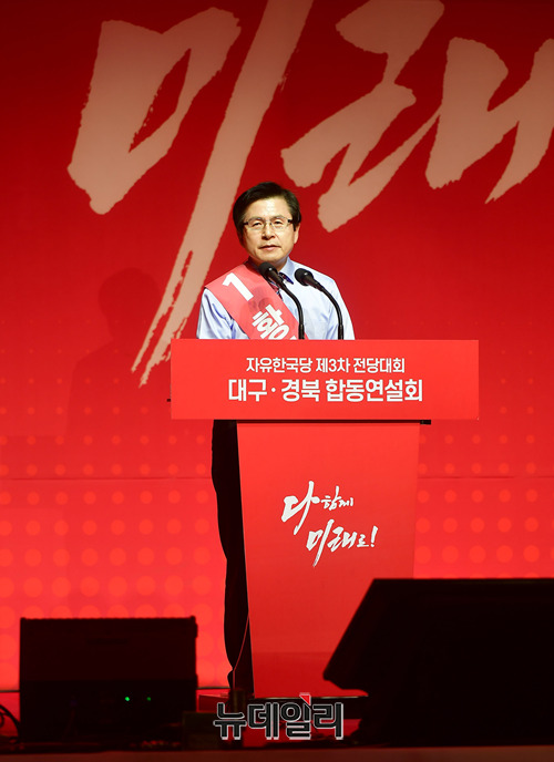 황교안 자유한국당 당대표 후보가 18일 오후 대구 북구 엑스코 컨벤션센터에서 열린 2·27 전당대회 대구·경북권 합동연설회에서 지지를 호소하고 있다.당대표 후보에는 김진태, 황교안, 오세훈이 나섰다. 최고위원에는 김정희 한국무궁화회 총재, 윤재옥 의원, 윤영석 의원, 김순례 의원, 조대원 경기 고양시정 당협위원장, 김광림 의원, 조경태 의원, 정미경 전 의원 등 8명이 나섰다. 청년 최고위원에는 신보라, 김준교, 이근열, 박진호 등 4명이 이름을 올렸다.합동연설회는 지난 14일 대전에서 충청·호남권을 시작으로 △18일 대구(대구·경북권) △21일 부산(부산·울산·경남·제주권) △22일 경기(서울·인천·경기·강원) 지역에서 열린다. 전당대회는 미북정상회담이 진행되는 27일 일산 킨텍스에서 진행된다. (대구=정상윤 기자)