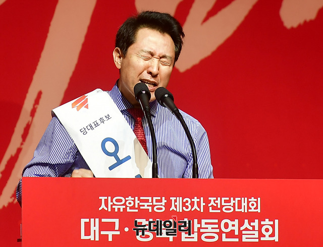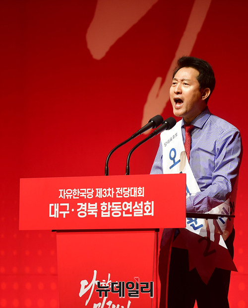 오세훈 자유한국당 당대표 후보가 18일 오후 대구 북구 엑스코 컨벤션센터에서 열린 2·27 전당대회 대구·경북권 합동연설회에서 지지를 호소하고 있다.당대표 후보에는 김진태, 황교안, 오세훈이 나섰다. 최고위원에는 김정희 한국무궁화회 총재, 윤재옥 의원, 윤영석 의원, 김순례 의원, 조대원 경기 고양시정 당협위원장, 김광림 의원, 조경태 의원, 정미경 전 의원 등 8명이 나섰다. 청년 최고위원에는 신보라, 김준교, 이근열, 박진호 등 4명이 이름을 올렸다.합동연설회는 지난 14일 대전에서 충청·호남권을 시작으로 △18일 대구(대구·경북권) △21일 부산(부산·울산·경남·제주권) △22일 경기(서울·인천·경기·강원) 지역에서 열린다. 전당대회는 미북정상회담이 진행되는 27일 일산 킨텍스에서 진행된다. (대구=정상윤 기자)