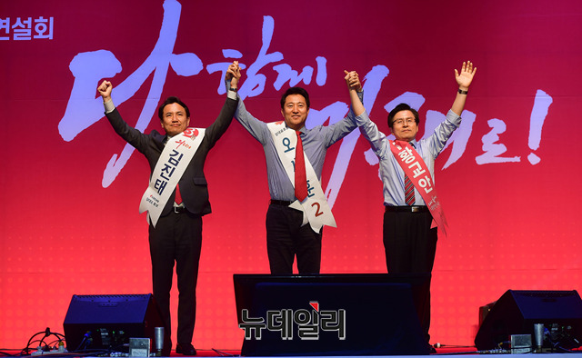김진태(왼쪽부터), 오세훈, 황교안 자유한국당 당대표 후보들이 18일 오후 대구 북구 엑스코 컨벤션센터에서 열린 2·27 전당대회 대구·경북권 합동연설회 직후 손을 맞잡고 당원들에게 인사를 나누고 있다. 다음 합동연설회는 21일 부산 벡스코에서 열린다. (대구=정상윤 기자)