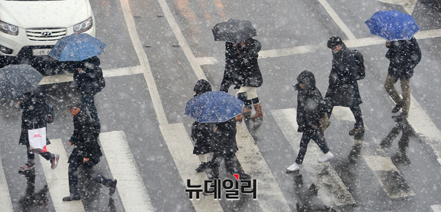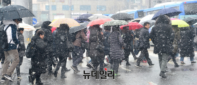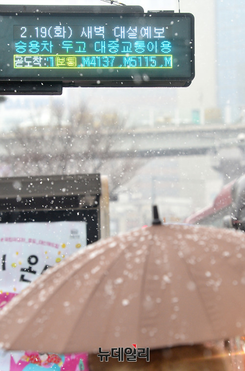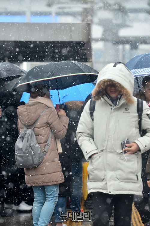 전국적으로 대설주의보가 발령된 19일 오전 서울역에서 출근하는 시민들이 우산을 쓰고 출근하고 있다. 현재 서울에는 눈이 그친 상황이다.