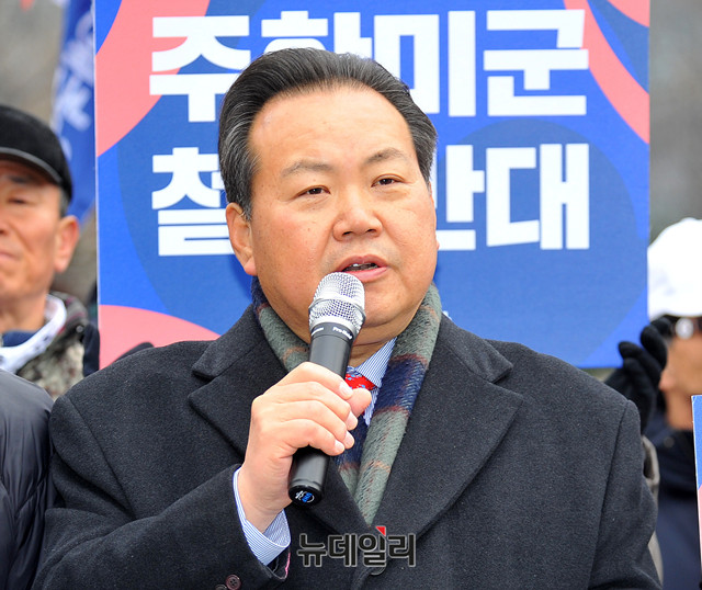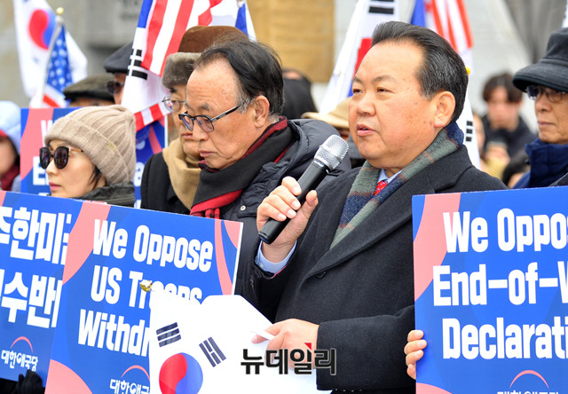 박태우 대한애국당 사무총장이 19일 오후 서울 광화문 세종대왕 동상 앞에서 열린 '종전선언 반대, 주한미군 철수 반대, 평화협정 체결 반대' 기자회견에 참석해 성명문을 낭독하고 있다.