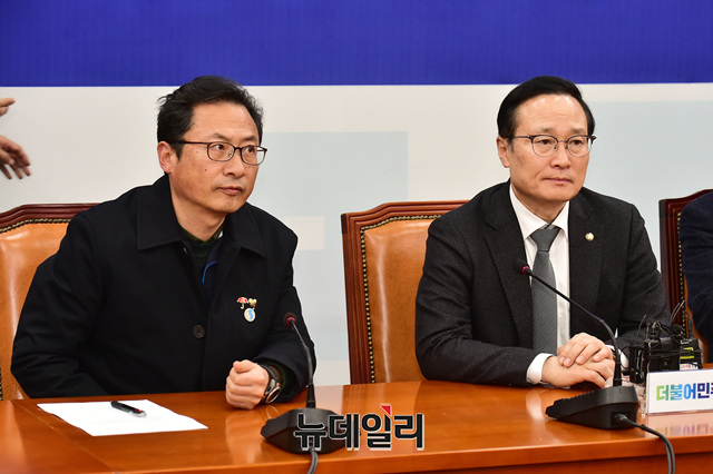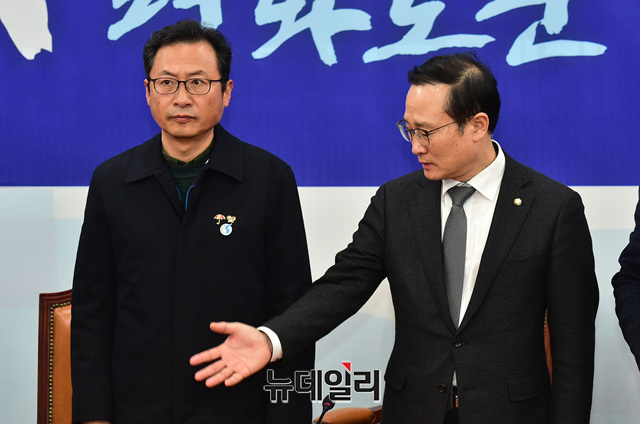 [포토] 데면데면한 홍영표 원내대표와 민노총 지도부