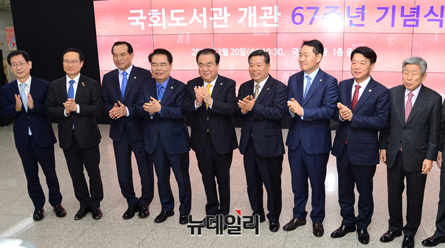 문희상 국회의장, 홍영표 더불어민주당 원내대표, 김관영 바른미래당 원내대표 및 참석자들이 20일 오전 국회 도서관에서 열린 '개관 67주년 기념식'에 참석해 기념촬영을 하고 있다.