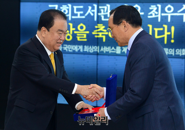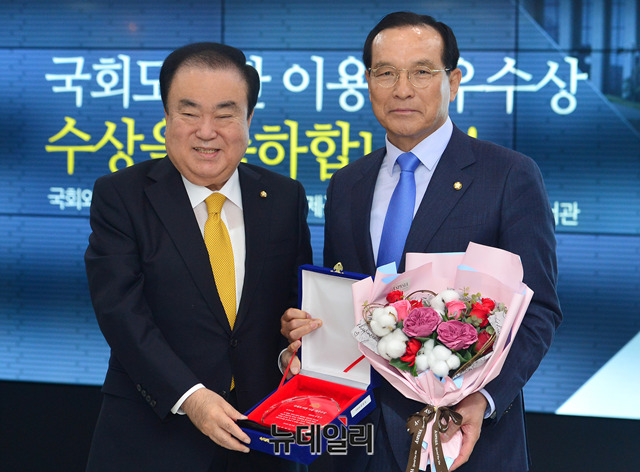 문희상 국회의장이 20일 오전 국회 도서관에서 열린 '개관 67주년 기념식'에서 김중로 바른미래당 의원에게 '국회도서관 이용 최우수 의원상'을 시상하고 기념촬영을 하고 있다.