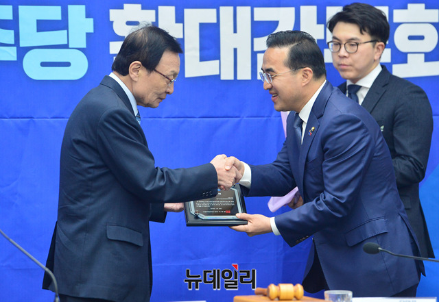 이해찬 더불어민주당 대표가 20일 오전 국회에서 열린 확대간부회의에 앞서 박홍근 더불어민주당 을지로 위원회 위원장에게 감사패를 전달하고 있다.