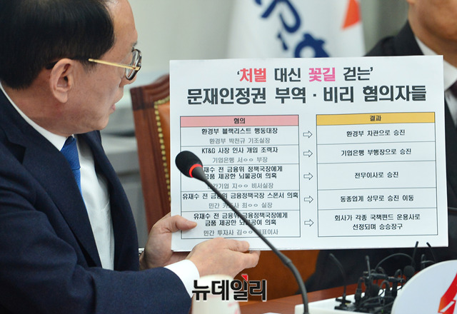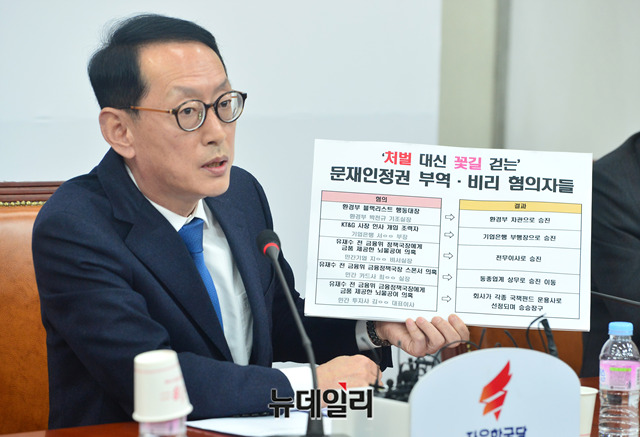 김도읍 자유한국당 의원이 20일 오전 국회에서 열린 청와대 특감반 진상조사단 및 김경수 드루킹 특별위원회 연석회의에서 문재인 정권 부역 비리 혐의자들에 관련해 발언을 하고 있다.