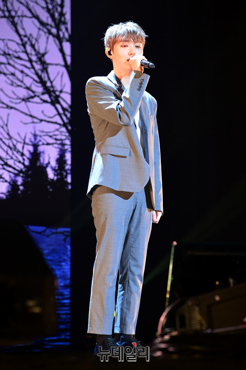 가수 윤지성이 20일 오후 서울 용산구 블루스퀘어 아이마켓홀에서 열린 첫 번째 미니앨범 'Aside(어사이드)' 발매기념 쇼케이스에서 신곡을 선보이고 있다.