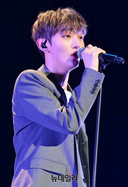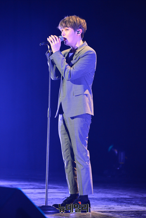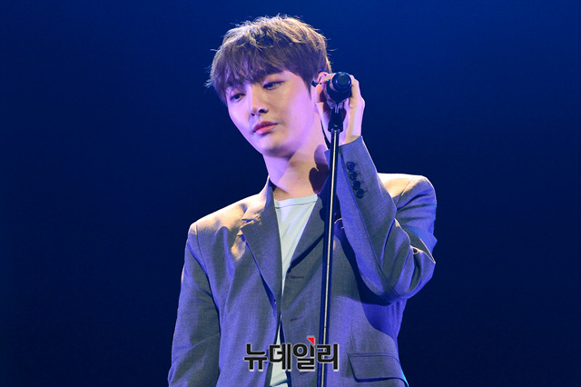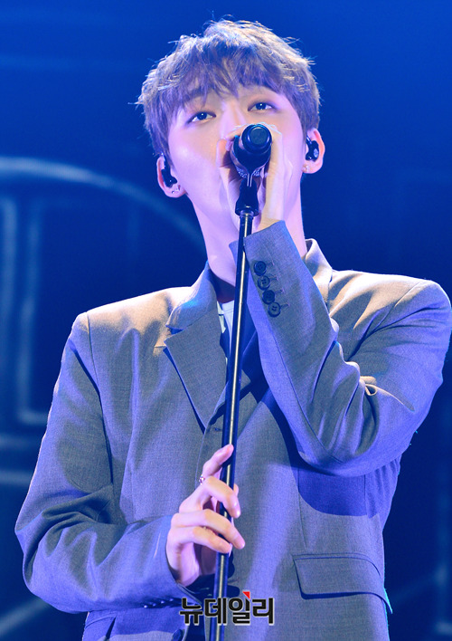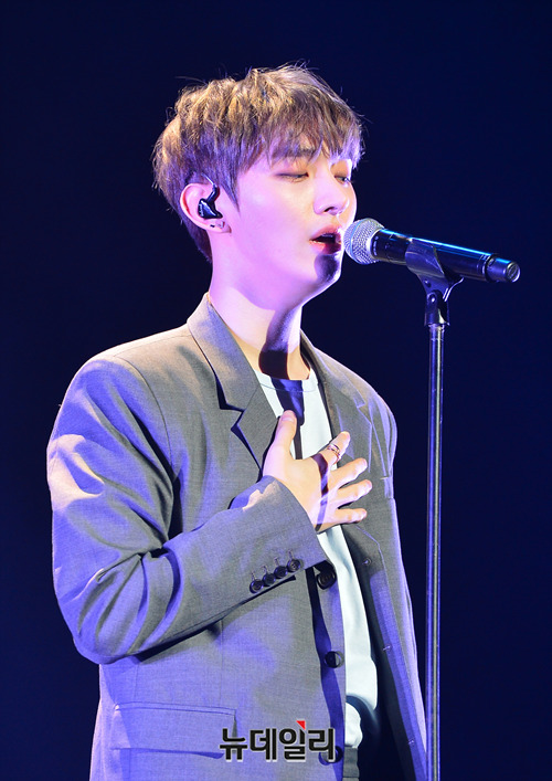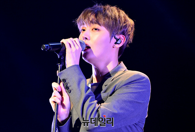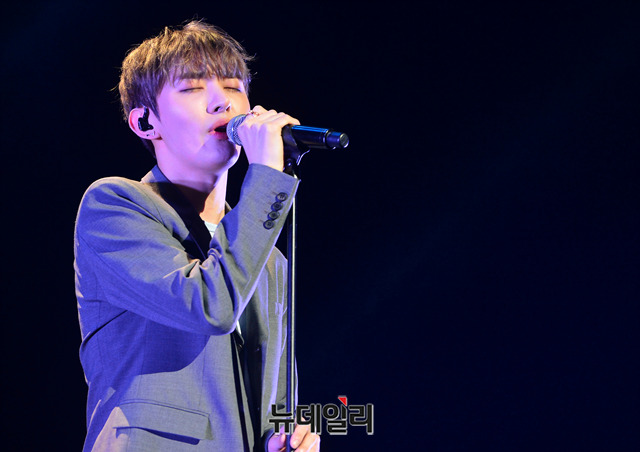 가수 윤지성이 20일 오후 서울 용산구 블루스퀘어 아이마켓홀에서 열린 첫 번째 미니앨범 'Aside(어사이드)' 발매기념 쇼케이스에서 포토타임을 갖고 있다.
