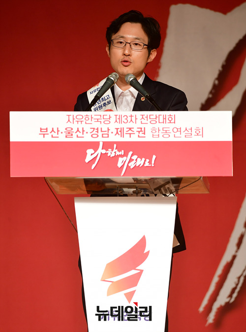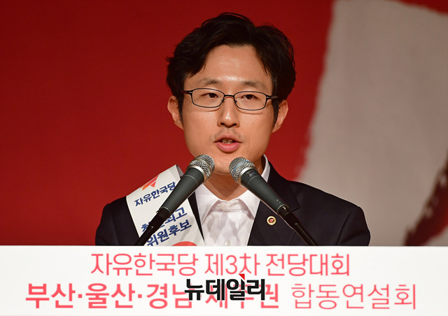 김준교 자유한국당 청년최고위원 후보가 21일 오후 부산 해운대구 벡스코에서 열린 2·27 전당대회 부산·울산·경남·제주권 합동연설회에서 지지를 호소하고 있다. (부산=정상윤 기자)