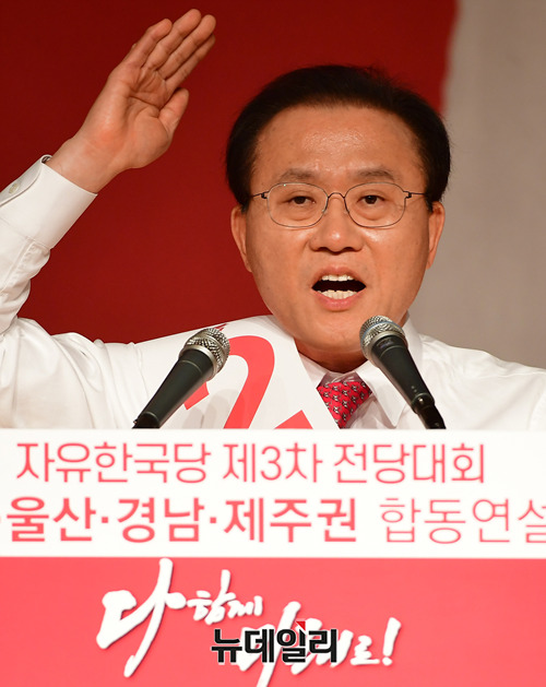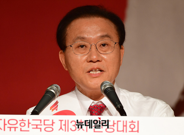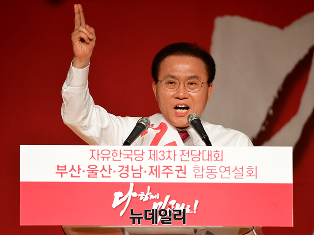 윤재옥 자유한국당 최고위원 후보가 21일 오후 부산 해운대구 벡스코에서 열린 2·27 전당대회 부산·울산·경남·제주권 합동연설회에서 정견발표를 하고 있다. (부산=정상윤 기자)