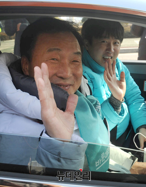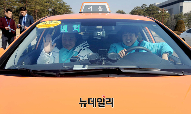 손학규 바른미래당 대표와 이준석 최고위원이 21일 오후 국회 본청 앞에서 택시를 타고 '손다방, 국민 속으로 : 민생의 바로미터 택시기사를 만나다'에 참석하기 위해 인천공항으로 출발하고 있다.