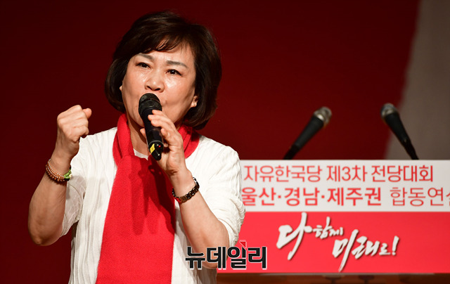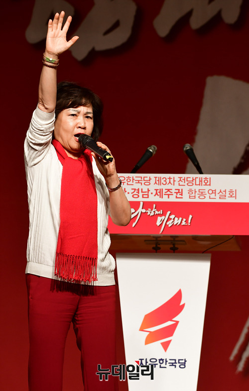 김순례 자유한국당 최고위원 후보가 21일 오후 부산 해운대구 벡스코에서 열린 2·27 전당대회 부산·울산·경남·제주권 합동연설회에서 정견발표를 하고 있다. (부산=정상윤 기자)