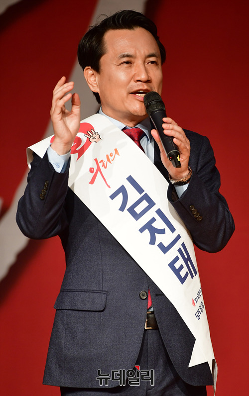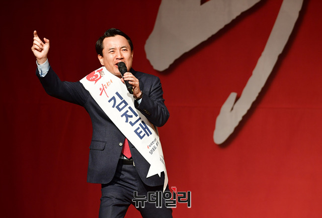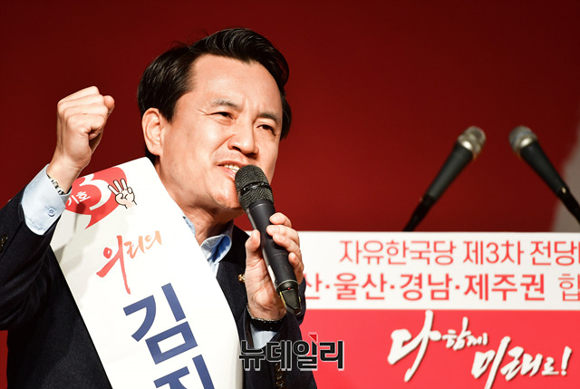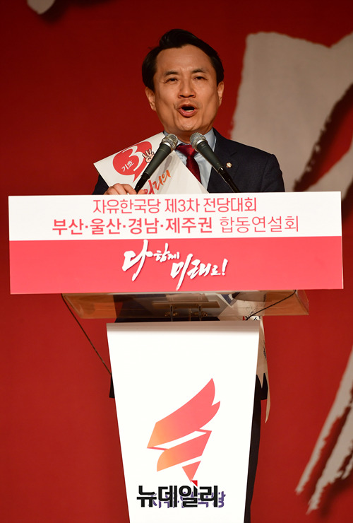 김진태 자유한국당 당대표 후보가 21일 오후 부산 해운대구 벡스코에서 열린 2·27 전당대회 부산·울산·경남·제주권 합동연설회에서 지지를 호소하고 있다.당대표 후보에는 김진태, 황교안, 오세훈이 나섰다. 최고위원에는 김정희 한국무궁화회 총재, 윤재옥 의원, 윤영석 의원, 김순례 의원, 조대원 경기 고양시정 당협위원장, 김광림 의원, 조경태 의원, 정미경 전 의원 등 8명이 나섰다. 청년 최고위원에는 신보라, 김준교, 이근열, 박진호 등 4명이 이름을 올렸다.합동연설회는 지난 14일 대전에서 충청·호남권을 시작으로 △18일 대구(대구·경북권) △21일 부산(부산·울산·경남·제주권) △22일 경기(서울·인천·경기·강원) 지역에서 열리고 있다. 전당대회는 미북정상회담이 진행되는 27일 일산 킨텍스에서 진행된다. (부산=정상윤 기자)
