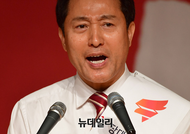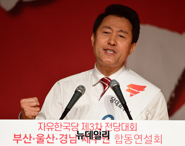 오세훈 자유한국당 당대표 후보가 21일 오후 부산 해운대구 벡스코에서 열린 2·27 전당대회 부산·울산·경남·제주권 합동연설회에서 지지를 호소하고 있다.당대표 후보에는 김진태, 황교안, 오세훈이 나섰다. 최고위원에는 김정희 한국무궁화회 총재, 윤재옥 의원, 윤영석 의원, 김순례 의원, 조대원 경기 고양시정 당협위원장, 김광림 의원, 조경태 의원, 정미경 전 의원 등 8명이 나섰다. 청년 최고위원에는 신보라, 김준교, 이근열, 박진호 등 4명이 이름을 올렸다.합동연설회는 지난 14일 대전에서 충청·호남권을 시작으로 △18일 대구(대구·경북권) △21일 부산(부산·울산·경남·제주권) △22일 경기(서울·인천·경기·강원) 지역에서 열리고 있다. 전당대회는 미북정상회담이 진행되는 27일 일산 킨텍스에서 진행된다. (부산=정상윤 기자)