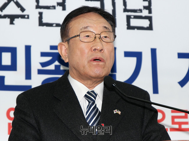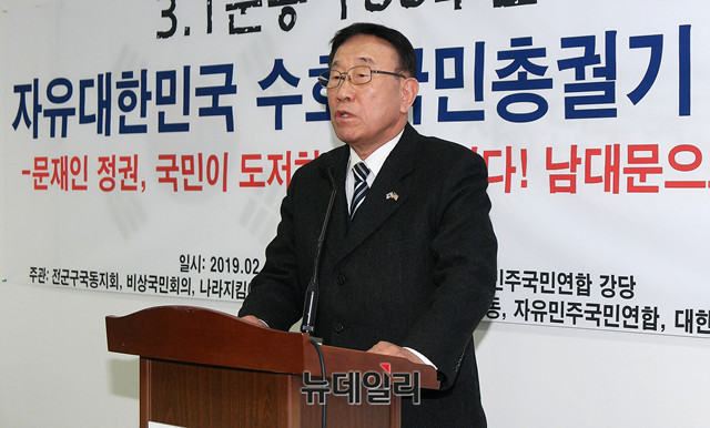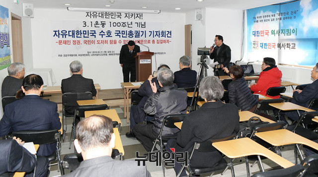 정광작 애국진영 3.1절 국민대회 추진단장이 21일 오후 서울 종로구 자유민주국민연합 강당에서 열린 '3.1운동 100주년 기념 자유대한민국 수호 국민총궐기' 기자회견에 참석해 인사말을 하고 있다.이날 정 단장은 "3.1절 100주년을 맞아 자유대한민국을 부정하고 공산주의 체제로 전환을 시도하고 있는 주사파 정부에 대해서 강력히 항의하는 국민총궐기대회를 대한문에서 진행할 것"이라며 "많은 국민이 동참해 3.1절 행사를 뜻깊고 국민이 소망하는 방향으로 진행되길 바란다"고 밝혔다.