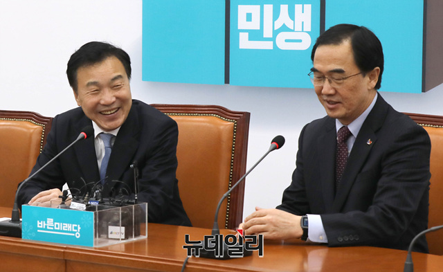 손학규 바른미래당 대표가 22일 오전 국회 당 대표실에서 조명균 통일부 장관을 만나 대화를 나누고 있다.