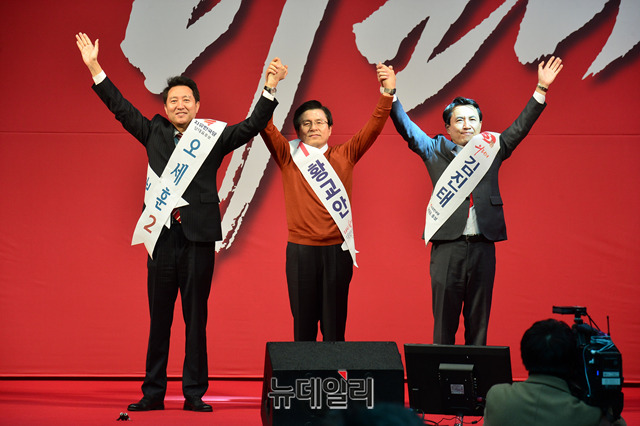 오세훈(왼쪽부터), 황교안, 김진태 자유한국당 당대표 후보가 22일 오후 경기 성남 실내체육관에서 열린 2·27 전당대회 서울인천경기강원권 합동연설회에서 인사를 하고 있다.당대표 후보에는 김진태, 황교안, 오세훈이 나섰다. 최고위원에는 김정희 한국무궁화회 총재, 윤재옥 의원, 윤영석 의원, 김순례 의원, 조대원 경기 고양시정 당협위원장, 김광림 의원, 조경태 의원, 정미경 전 의원 등 8명이 나섰다. 청년최고위원에는 신보라, 김준교, 이근열, 박진호 등 4명이 이름을 올렸다.합동연설회는 지난 14일 대전에서 충청·호남권을 시작으로 △18일 대구(대구·경북권) △21일 부산(부산·울산·경남·제주권) △22일 경기(서울·인천·경기·강원) 지역에서 열린다. 전당대회는 미북정상회담이 진행되는 27일 일산 킨텍스에서 진행된다. (경기 성남=박성원 기자)