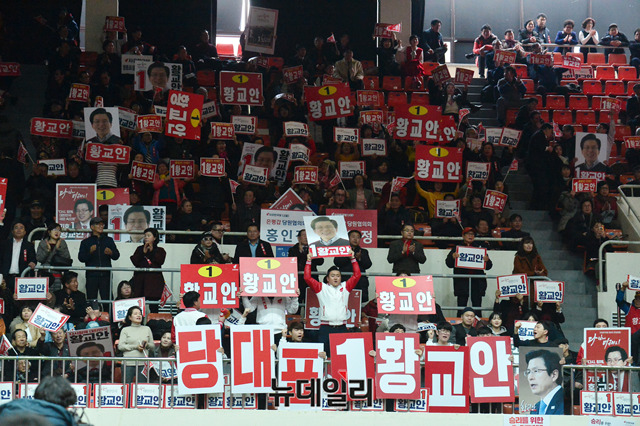 황교안 자유한국당대표 후보의 지지자들이 22일 오후 경기 성남 실내체육관에서 열린 2·27 전당대회 수도권·강원권 합동연설회에서 피켓을 들고 있다. 전당대회는 미북정상회담이 진행되는 27일 일산 킨텍스에서 진행된다. (경기 성남=박성원 기자)