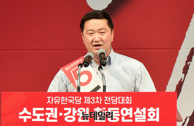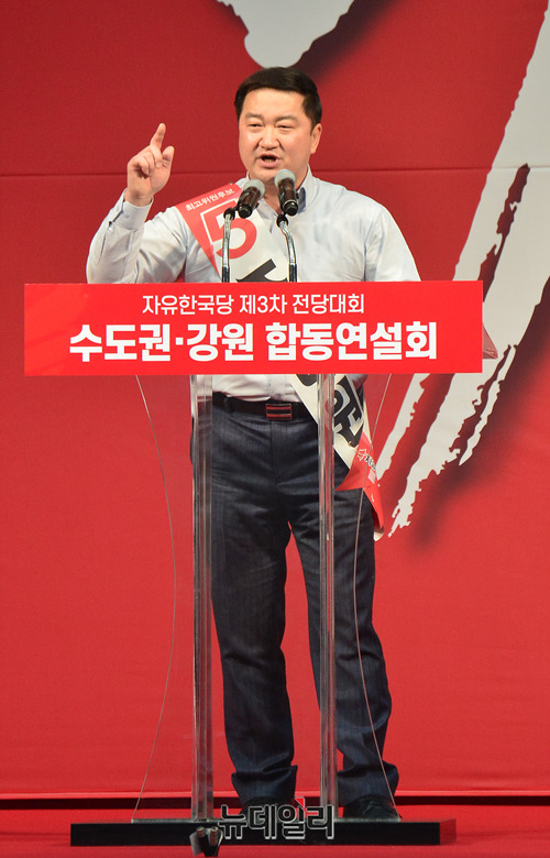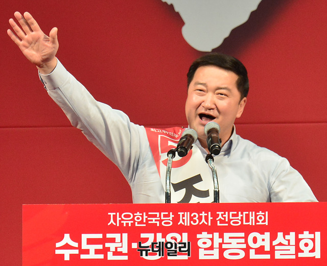 조대원 자유한국당 최고위원 후보가 22일 오후 경기 성남 실내체육관에서 열린 2·27 전당대회 수도권·강원권 합동연설회에서 지지를 호소하고 있다. 전당대회는 미북정상회담이 진행되는 27일 일산 킨텍스에서 진행된다. (경기 성남=박성원 기자)