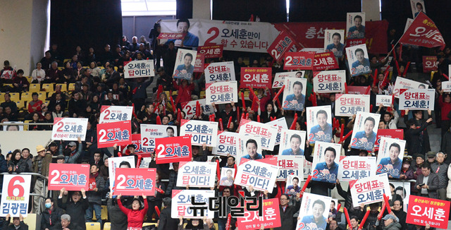 오세훈 자유한국당대표 후보의 지지자들이 22일 오후 경기 성남 실내체육관에서 열린 2·27 전당대회 수도권·강원권 합동연설회에서 피켓을 들고 구호를 외치고 있다. 전당대회는 미북정상회담이 진행되는 27일 일산 킨텍스에서 진행된다. (경기 성남=박성원 기자)