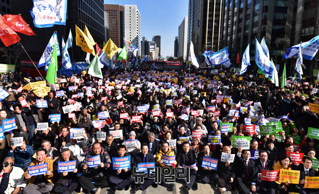 '5.18 민주화운동 왜곡 모독 망언 3인 국회의원 퇴출, 5.18 학살·역사왜곡 처벌법 제정, 자유한국당 규탄 범국민대회'가 23일 오후 서울 종로구 청계광장에서 열린 가운데 참석자들이 구호를 외치고 있다.