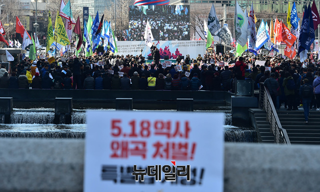 '5.18 민주화운동 왜곡 모독 망언 3인 국회의원 퇴출, 5.18 학살·역사왜곡 처벌법 제정, 자유한국당 규탄 범국민대회'가 23일 오후 서울 종로구 청계광장에서 열리고 있다.