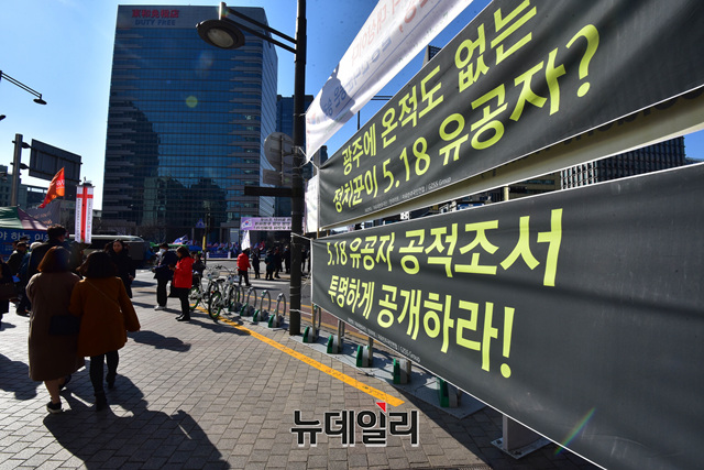 [포토] 광화문 인근에 걸린 "5.18 유공자 공적조서 투명하게 공개하라" 플래카드