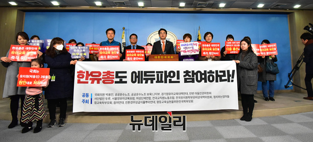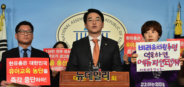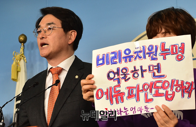 박용진 더불어민주당 의원 및 학부모단체가 25일 오전 국회 정론관에서 에듀파인 사용을 거부하며 대규모 집회를 예정한 한유총(한국유치원단체총연합회)을 규탄 기자회견을 갖고 있다.