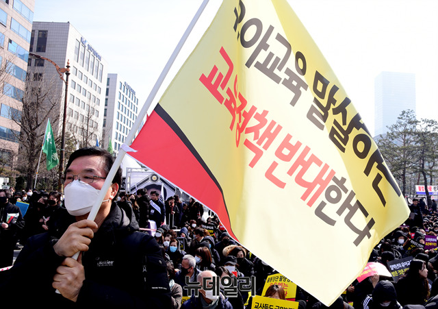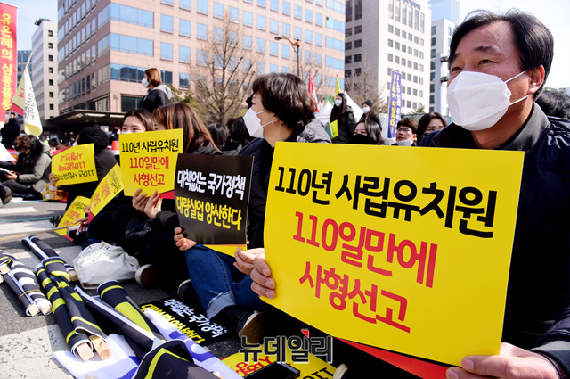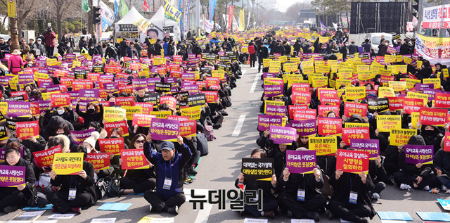 한국유치원총연합회가 25일 오후 국회 정문 앞 도로에서 열린 '교육부 시행령 반대 총궐기대회'에서 피켓을 들고 '에듀파인'에 반대하는 구호를 외치고 있다.